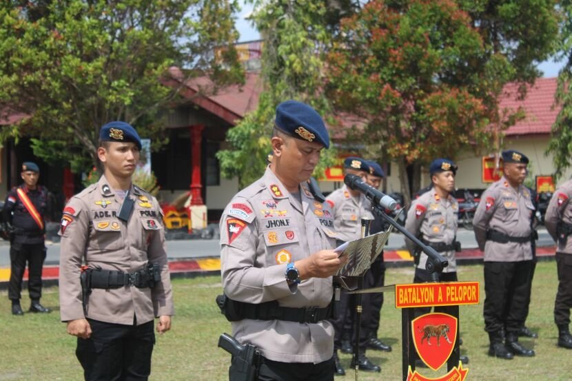 Pekanbaru, Riau - Danyon A Pelopor Satbrimobda Riau, AKBP Jhon Firdaus, A.Mk, S.H., memimpin upacara tradisi penyambutan Baja Taja angkatan 52 & 53 di lapangan hijau Satuan Brimob Polda Riau, Selasa (27/1/2026).